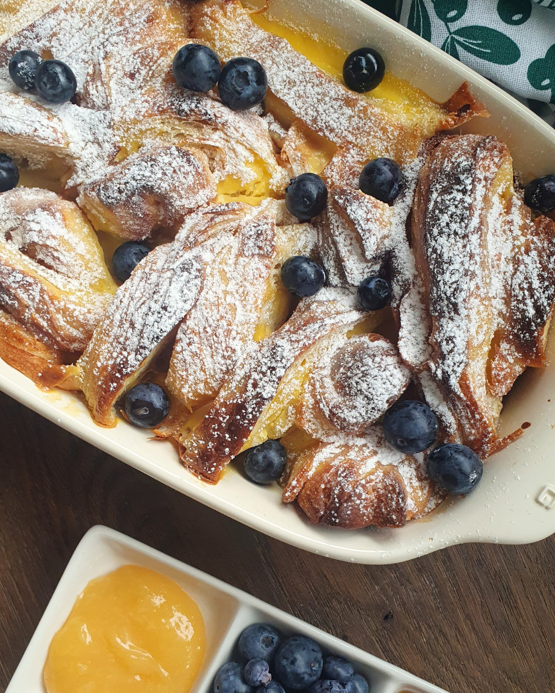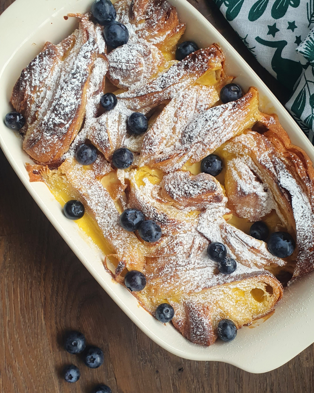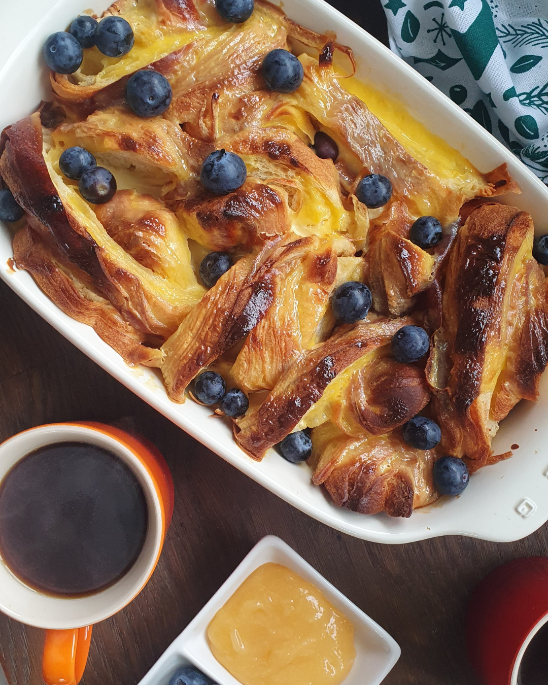 Made with our house-made croissants, bursting with festive flavour from blueberries, lemon curd, and a silky lemon crème anglaise, it’s ready for you to assemble and bake fresh at home.