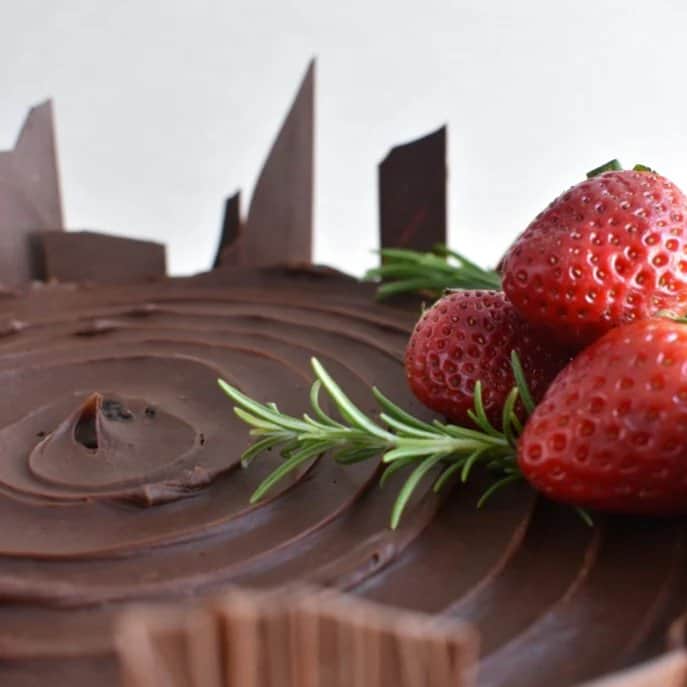 Rich Chocolate cake, chocolate ganache & seasonal berries. A delicious sharing festive cake.
